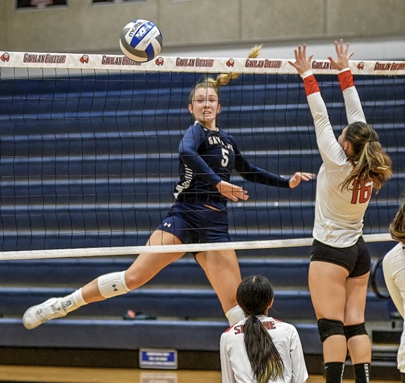 Makenna Deeth going up for the attack during her 2022 collegiate indoor volleyball campaign (via Gilroy Dispatch)